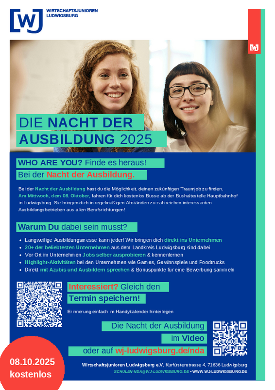 The Night of Training 2025 in Ludwigsburg and Bietigheim is under the patronage of Dietmar Allgaier, District Administrator of the Ludwigsburg district, and Dr. Matthias Knecht, Lord Mayor of the city of Ludwigsburg. The event, organized by the Wirtschaftsjunioren Ludwigsburg in cooperation with the IHK Region Stuttgart, Bezirkskammer Ludwigsburg, gives pupils from over 30 schools in the district a unique look behind the scenes of regional companies. Instead of walking past trade fair stands, the young people can immerse themselves directly in companies - in a practical, authentic and varied way.