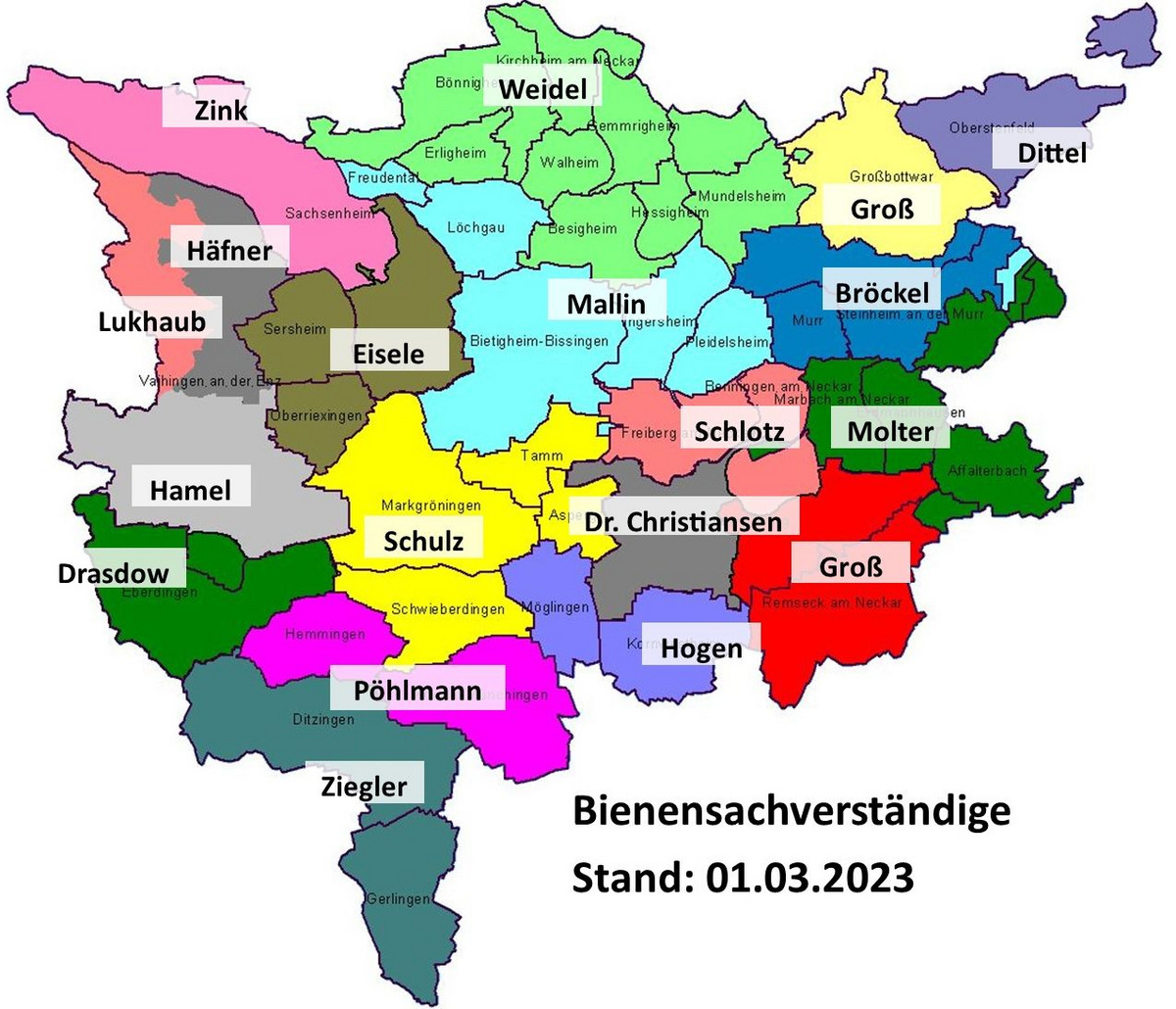 Aus Gründen historisch gewachsener Strukturen hat auch der BV Leonberg e.V. Mitglieder im Gebiet des ehemaligen Landkreises Leonberg, das heute zum Landkreis Ludwigsburg gehört, ebenso der Bezirksimkerverein Backnang e.V. (Affalterbach, Marbach-Rielingshausen)