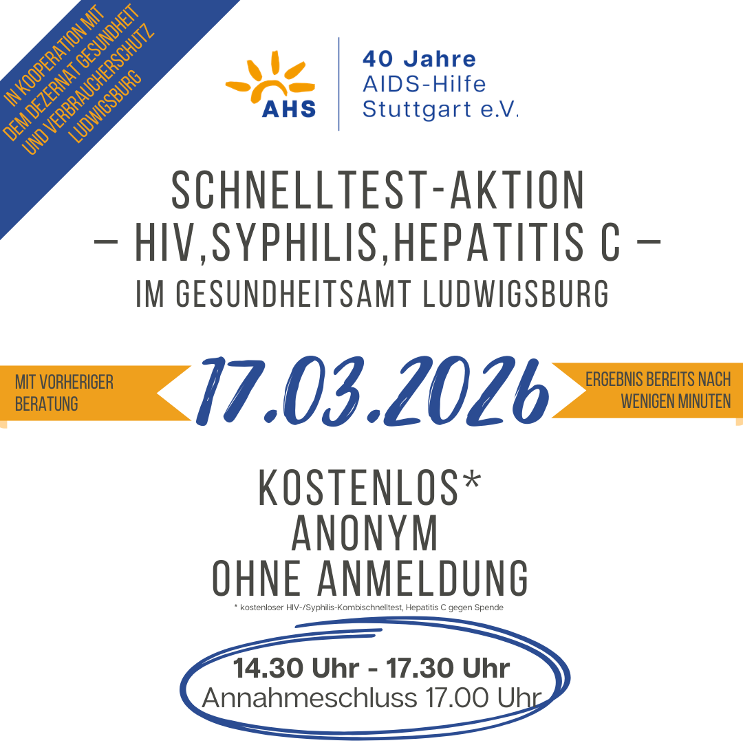 Il programma di test rapido è un'offerta congiunta del Dipartimento della Salute di Ludwigsburg e di AIDS-Hilfe Stuttgart e.V. ed è rivolto a tutti gli interessati che desiderano verificare il proprio stato in modo semplice e riservato.