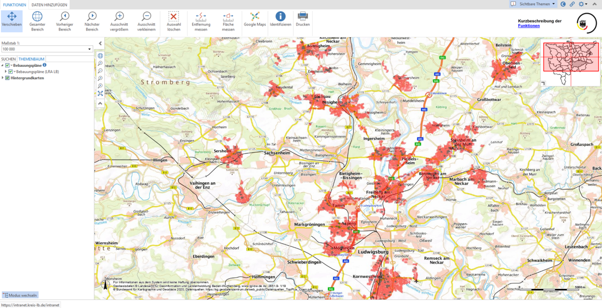 Mit Blick auf die bevorstehende gesetzliche Verpflichtung, die Bebauungspläne bis Oktober 2020 INSPIRE-konform (Infrastructure for spatial Information laut EU-Verordnung) zur Verfügung zu stellen, hat das Landratsamt Ludwigsburg bereits frühzeitig mit 31 Kommunen Vereinbarungen zur Digitalisierung der Bebauungspläne geschlossen. Durch diese vorausschauende Vorgehensweise und tatkräftige Unterstützung der Kommunen ist es gelungen, alle Bebauungspläne zu digitalisieren.