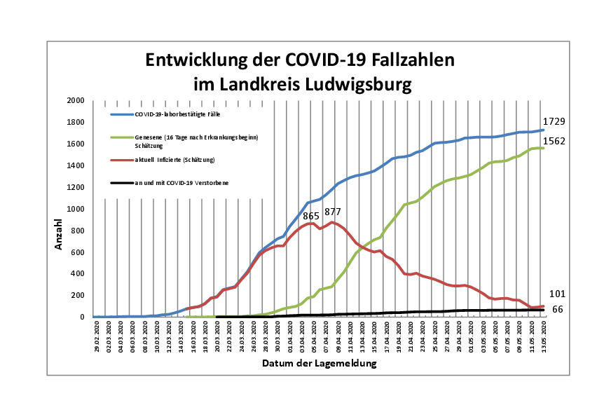 Die Gesamtzahl der bestätigten COVID-19-Fälle im Landkreis Ludwigsburg seit Beginn der Corona-Krise beträgt 1.729. Seit gestern sind 9 neue Fälle dazugekommen. Die Erkrankungsrate (Inzidenz/Fälle pro 100.000 Einwohner) im Landkreis Ludwigsburg beträgt 316,79. Insgesamt 66 mit COVID-19 infizierte Personen zwischen 43 und 100 Jahren sind verstorben. Als genesen gelten 1.562 Personen, als aktuell infiziert 101(Stand: 13.05.20). Der Wert der Neuinfektionen der letzten 7 Tage je 100.000 Einwohner beträgt 10,1.