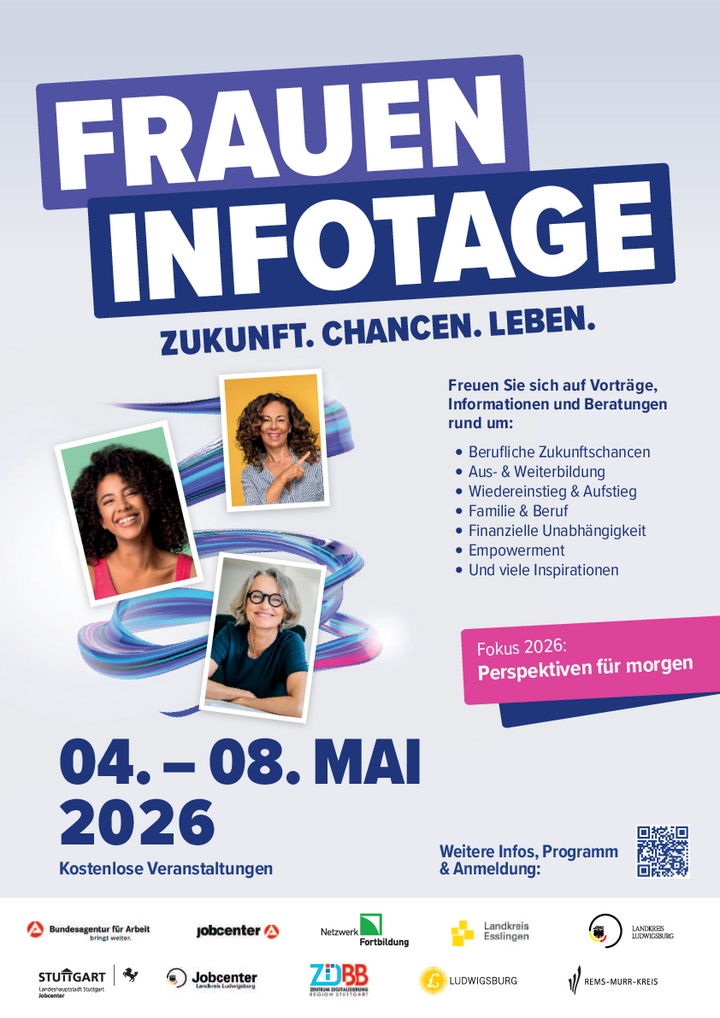 Ausgehend vom Landkreis Ludwigburg wurde das Erfolgsmodell der Frauen Infotage dieses Jahr auf die ganze Region Stuttgart ausgeweitet. Damit ziehen die beteiligten Arbeitsagenturen, Jobcenter und Gleichstellungsbeauftragten sowie die Leiterin des Projekts „The Chänce – Weiterbildungsscout“ des Zentrums für Digitalisierung Landkreis Böblingen (ZD.BB) an einem Strang. Mit dabei war von Anfang an das Institut für Business-Geographie Marbach.