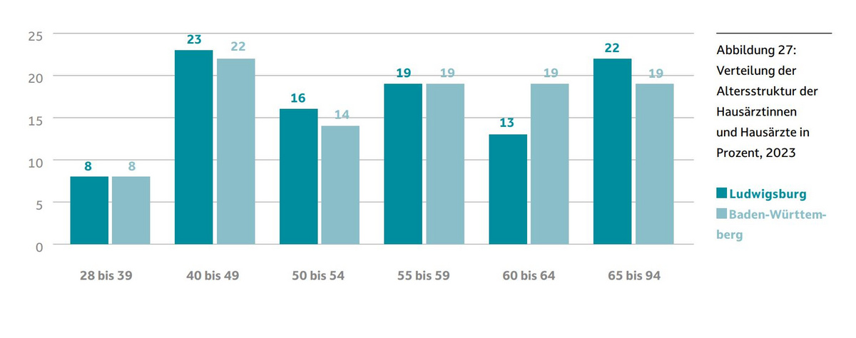 Die Kassenärztliche Vereinigung Baden-Württemberg (KVBW) steuert die Niederlassung von Hausärztinnen und Hausärzten anhand der Bedarfsplanung. Dabei ist der Landkreis in drei Mittelbereiche unterteilt. Die Versorgungsgrade betragen im Mittelbereich Ludwigsburg/Kornwestheim 108,1 Prozent, im Mittelbereich Vaihingen 86,9 Prozent und in Bietigheim/Besigheim 90,3 Prozent. Die Altersstruktur der Praktizierenden zeigt, dass 35 Prozent der Hausärztinnen und Hausärzte im Landkreis Ludwigsburg 60 Jahre oder älter sind. In einigen Mittelbereichen droht also eine Unterversorgung mit Hausärztinnen und Hausärzten, vor allem bedingt durch die Altersstruktur und potenzielle Probleme bei der Nachbesetzung, da es insbesondere bei den 28- bis 39-Jährigen wenig Nachwuchs gibt.