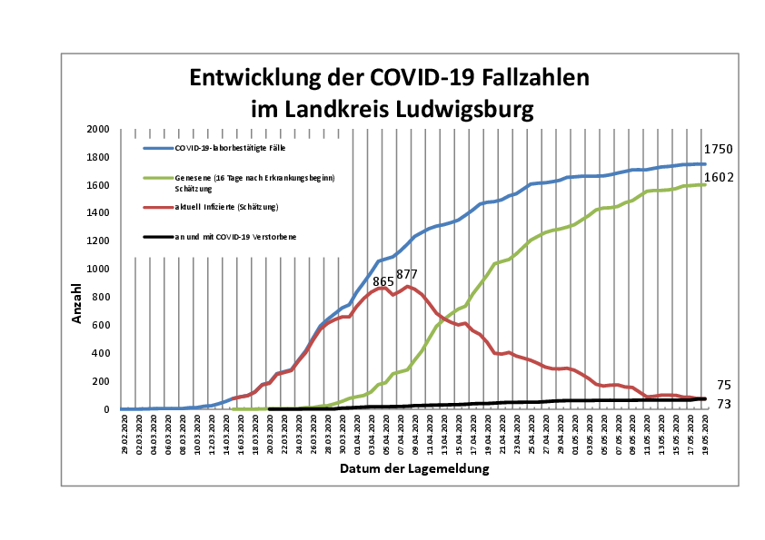 Insgesamt 1.750 laborbestätigte COVID-19-Fälle zählt das Landratsamt Ludwigsburg (Stand: 19.05.20, 16:45 Uhr). Seit gestern wurden keine neuen Fälle erfasst. Die Erkrankungsrate (Inzidenz/Fälle pro 100.000 Einwohner) im Landkreis Ludwigsburg liegt bei 320,6. In den letzten 7 Tagen wurden 5,5 Neuerkrankungen pro 100.000 Einwohner im Landkreis Ludwigsburg erfasst, also derzeit deutlich unter dem Grenzwert von 50. Seit Beginn der Corona-Krise sind im Landkreis Ludwigsburg 73 mit COVID-19 infizierte Personen im Alter zwischen 43 und 100 Jahren verstorben. Als genesen gelten 1.602 Personen, als aktuell infiziert 75 Personen. #katskreislb #coronavirus #covid19 #stayathome #bleibtzuhause