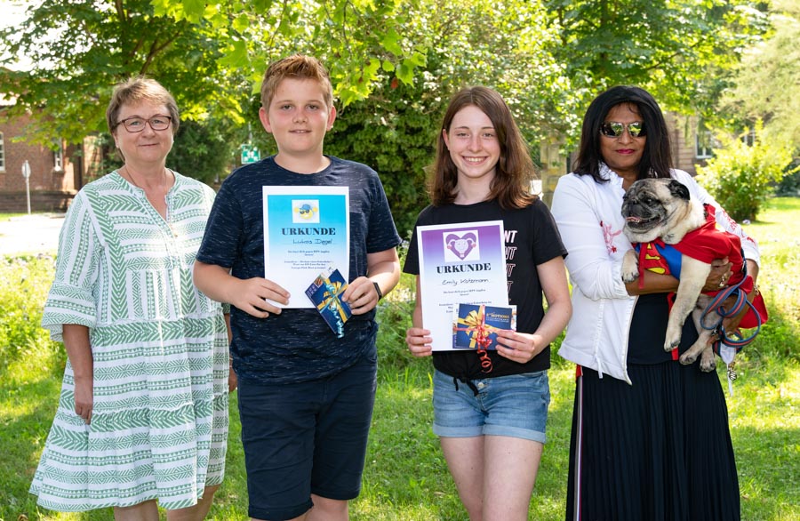 Dr. Uschi Traub, Leiterin der Gesundheitsförderung, und Gela Ertmann überreichten mit Maskottchen Superdog Pablo die Preise an die Gewinner der Verlosung im Rahmen der Kampagne. Emily Kotzmann (Stromberg-Gymnasium, Vaihingen an der Enz) und Lukas Dengel (zu Beginn der Kampagne im Hans-Grüninger-Gymnasium, Markgröningen und jetzt im Helene-Lange-Gymnasium, Markgröningen) freuten sich sehr über ihren Gewinn: Gutscheine im Wert von 110 Euro für den Europapark Rust.