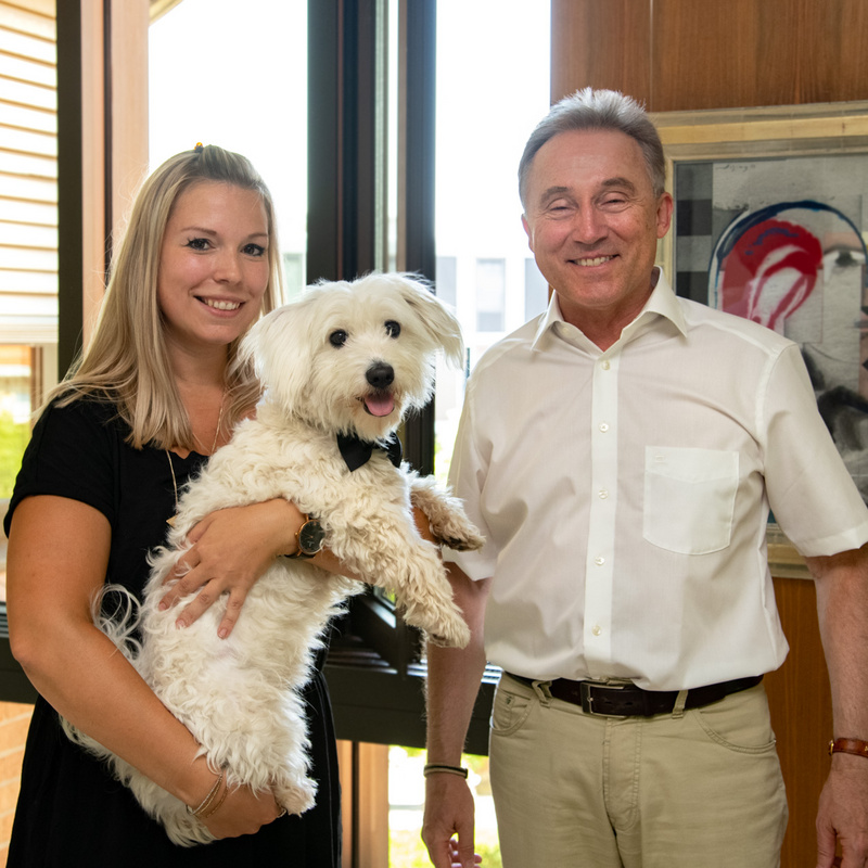Laura Ferring, Sozialarbeiterin beim Gesundheitsdezernat und Besitzerin von Keks informierte Landrat Dr. Haas über die Aufgaben eines Therapiehundes. So könne er beispielsweise durch seine offene und freundliche Art eine Brücke für Klientinnen und Klienten des Spdi darstellen und als Gesprächsöffner dienen. Außerdem trage er zur Stressreduktion bei, schaffe Vertrauen und baue Ängste ab, berichtete Ferring über Keks. Insgesamt schaffe es Keks durch seine Art, stets eine positive Atmosphäre unter Kolleginnen und Kollegen und den Klienten des Spdi zu erzeugen. Laura Ferring absolvierte mit Keks eine halbjährige Zusatzausbildung zum Therapiebegleithund-Team.